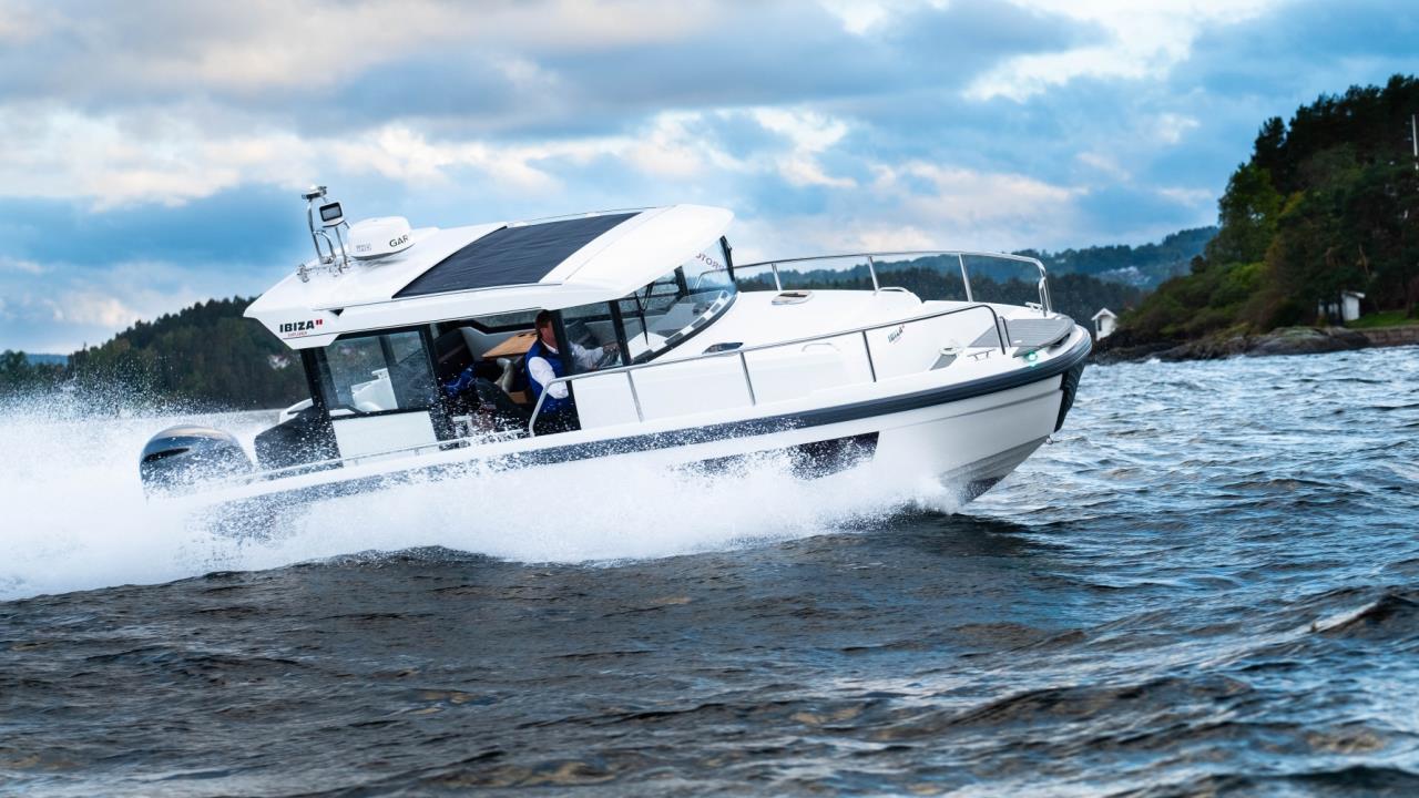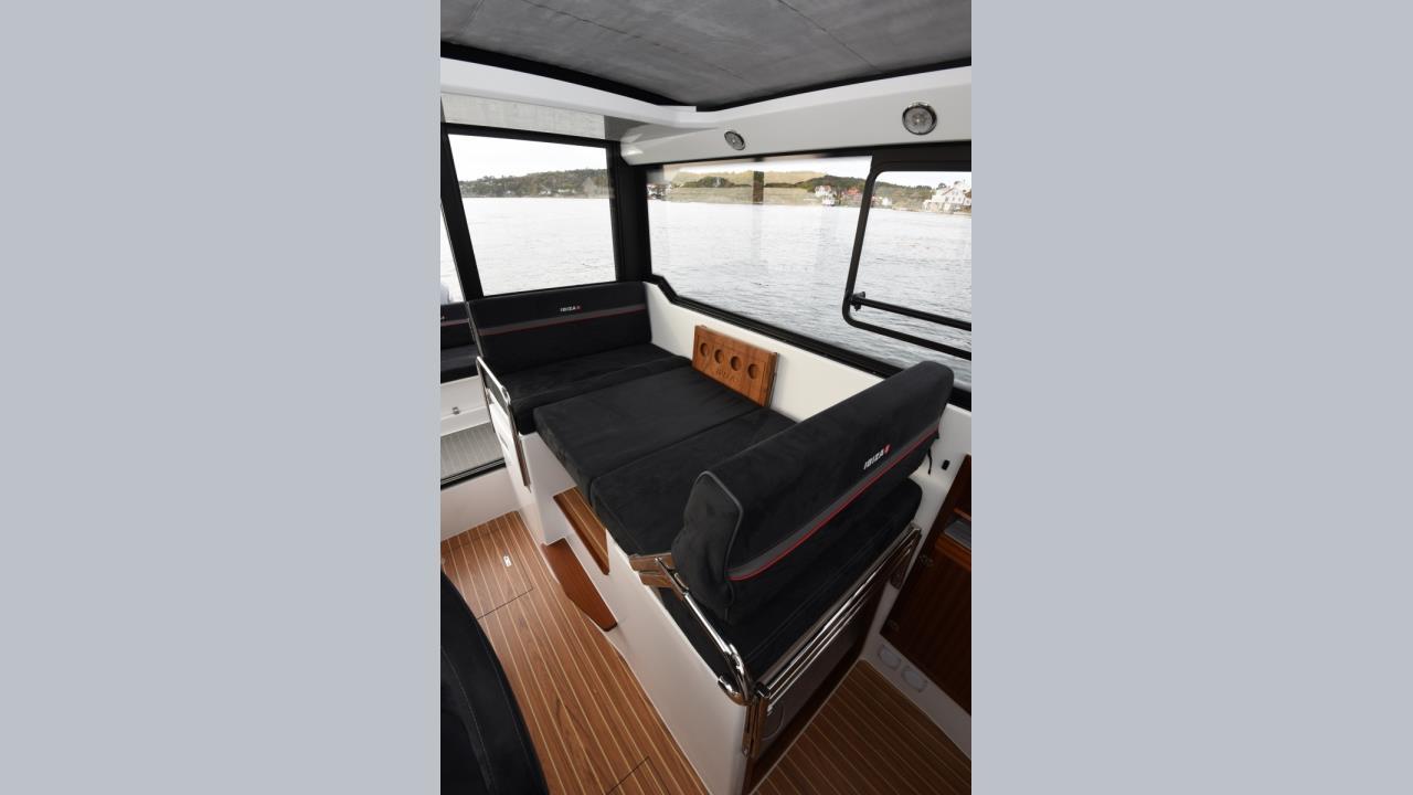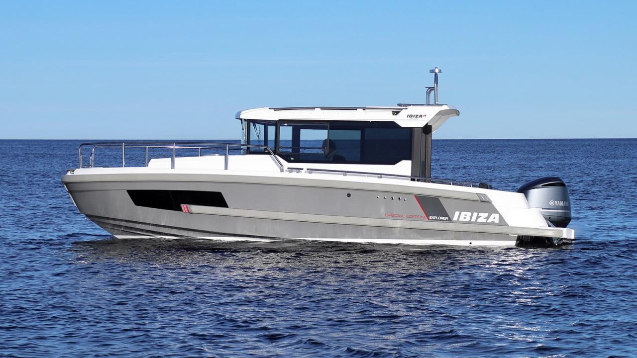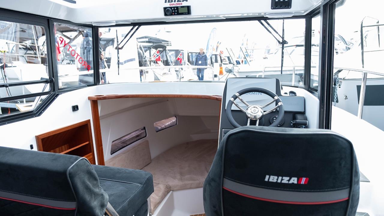 Sportig hyttbåt för Skandinaviska förhållanden! 811E är trygg och enkel. Uteplatsen på Ibiza Explorer är genomtänkt. Ett solitt och kraftigt räcke i fören går ända fram till bogen. En bred lucke över stuven i fören. Detta gör land och omborstigning trygg och enkel. Ett brett gångbord på s.b. sida gör det också tryggt och enkelt att röra sig från för till akter. 811E har många genomtänkta, goda lösningar. Styrhytten har två ingångar, en skjutdörr akterut och en vid s.b. sida. Båten är därav enkel att manövrera ensam. Viktfördelning och skrovkonstruktnion sörjer för en minimal planingströskel och mycket fin gång i tuff sjö. Hytten har stora glaspartier som ger god sikt för alla ombord. Två kraftiga vindrutetorkare på förliga rutan gör att sikten är bra även i dåligt väder. Fyra komfortabla sittplatser runt det fällbara bordet, där den främre soffans ryggstöd kan fällas för att sitta med utsikt förut.