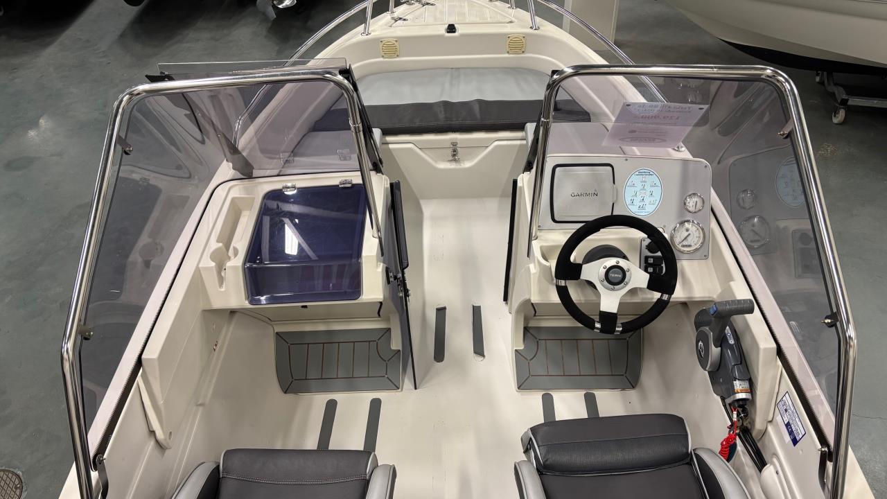 Badstege, Bottenmålning, Dragg & Dragglina, Dynor fören samt dynor akter med ryggdyna, Dörr samt ruta mellan pulpeter, Ellänspump, Eluttag 12V, Fendrar x 4, Förpulpit med hajfenor, Förtöjningslinor x 4, Motorlås, Powertrimmätare, Rutbågar, Självlänsande, Sjökortsplotter/Ekolod Garmin 525S med sjökort västkusten, Soldynsats i fören, Stolsöverdrag, Ståstol förarplats, Varvräknare.